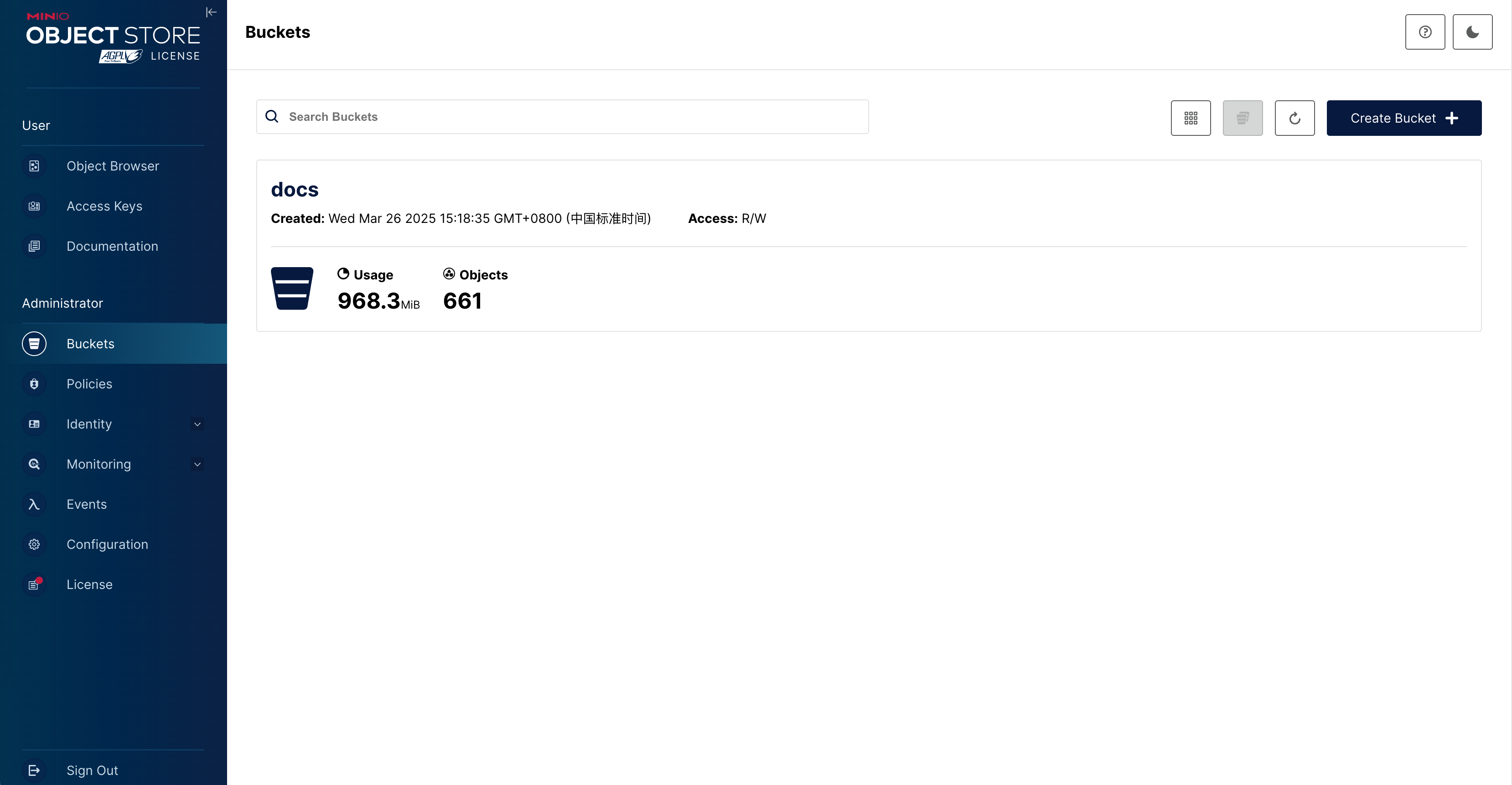 服务启动了之后,我们就可以在localhost:9001管理minio服务啦。和其他OSS服务一样,我们可以创建一个bucket: