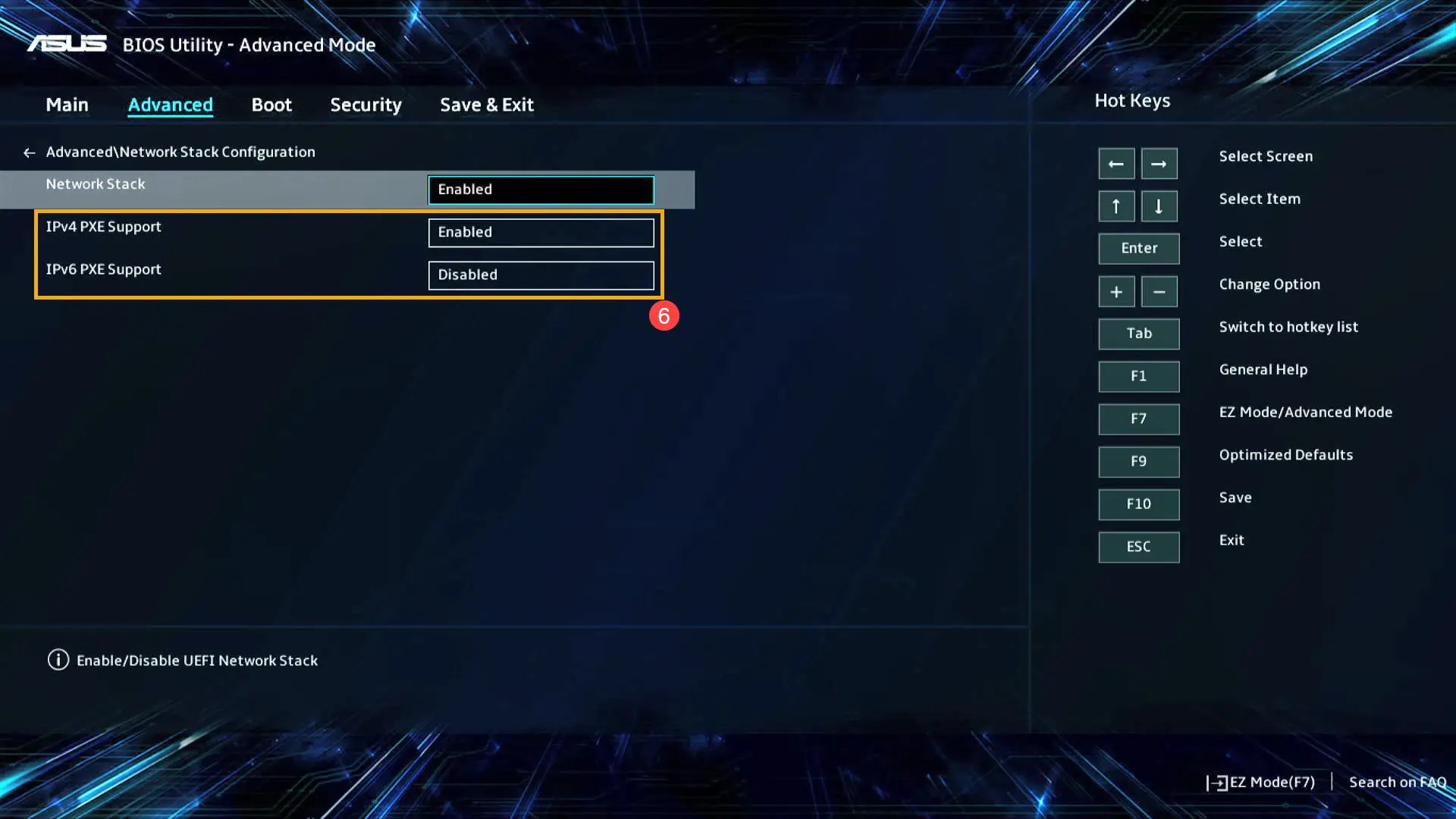 - After entering the Network Stack Configuration, select [Network Stack]④ and set [Enabled]⑤.