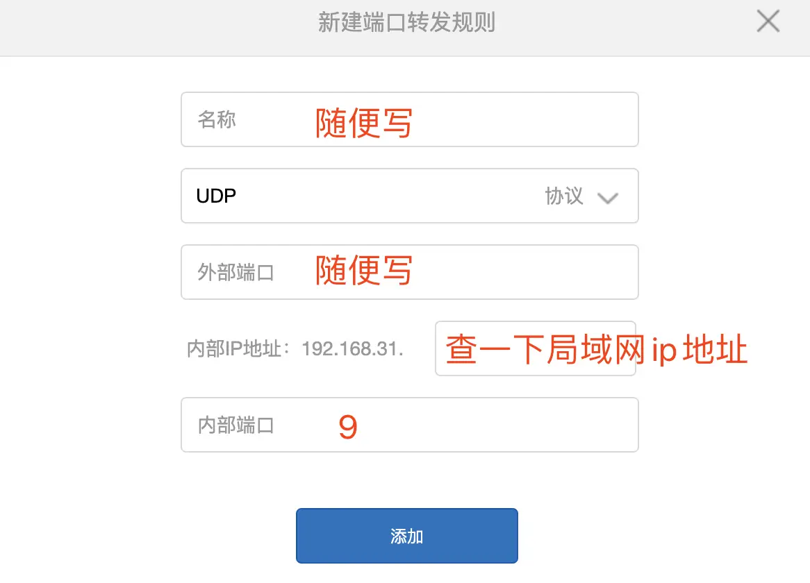 WOL走的是UDP协议,一般我们把包发送到想开机那台机器的9端口即可。所以需要添加端口映射: